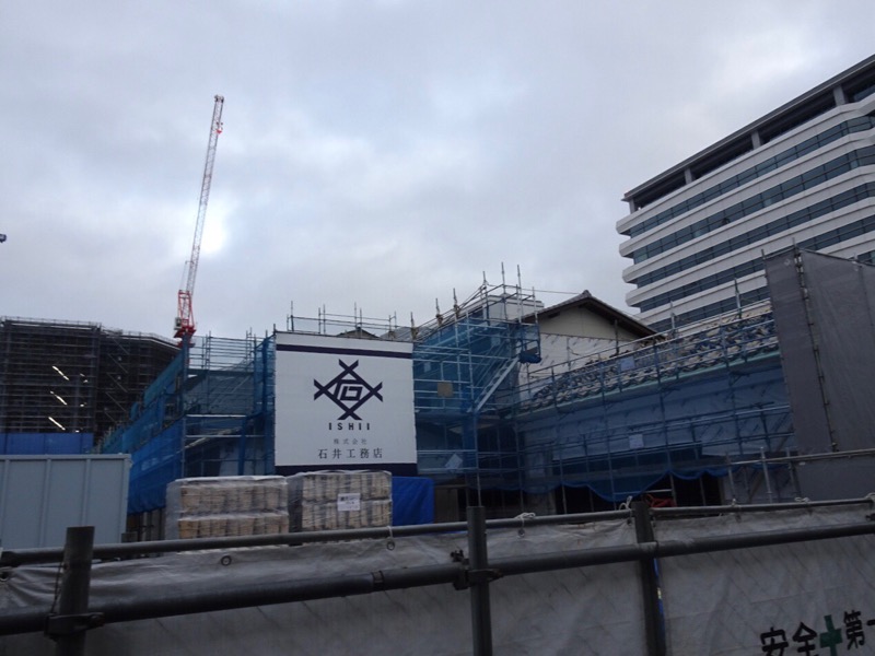 建設中の建物は、屋根の瓦葺きが始まっています。
